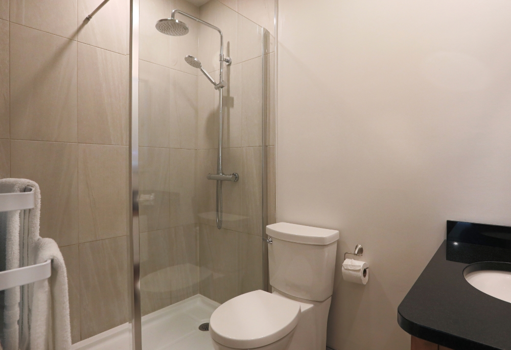 - Large glass shower with rain shower head